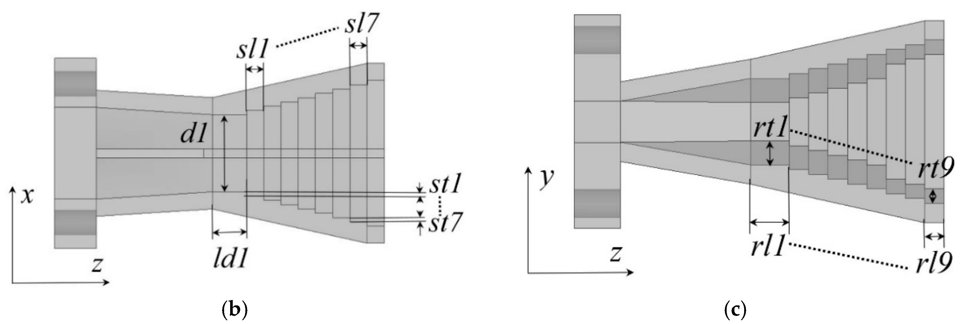 The physics governing a stepped horn antenna is described entirely in terms of ratios — the relationship between step dimensions, horn aperture, throat width, and the wavelength of the target frequency. There are no absolute dimensions in the governing equations. A stepped horn designed for 24 GHz microwave and one designed for 12.25 Hz infrasound follow identical geometric relationships — the infrasound version scaled up by approximately two billion in linear dimension. The physics does not change. Zhang et al. (2018, Applied Sciences, doi: 10.3390/app8010033) document a ridged horn geometry at microwave frequencies — longitudinal fins running parallel to the direction of propagation. Santa Cristina implements a stepped horn geometry — discrete cross-section reductions perpendicular to the direction of propagation at each course interval. These are distinct implementations: the ridged horn loads the cross-section continuously along the horn length; the stepped horn creates discrete impedance discontinuities at each step. Both support sub-wavelength TEM mode propagation through related mechanisms. The Zhang citation is valid for the propagation principle and the scale invariance of the governing ratios — not as a direct geometric equivalent.