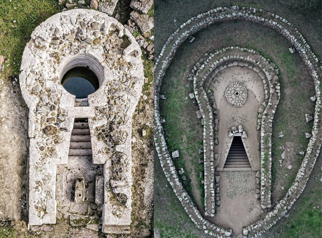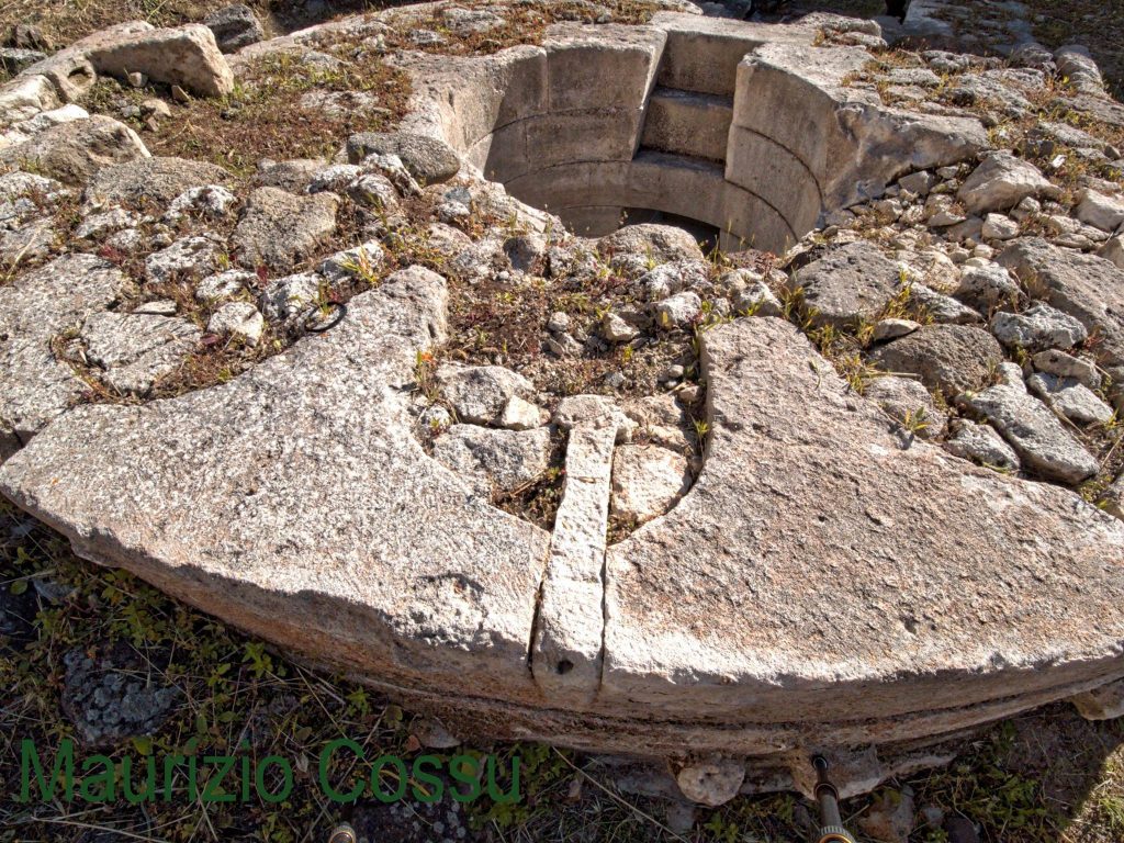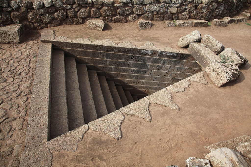 Ground-level photography of the nearby Nuragic sacred well at Predio Canopoli reveals triangular-profiled stones in its wall construction — and critically, where an upper stone is displaced or partially removed, the course beneath it shows the same triangular profile. The triangular geometry therefore extends through at least two visible courses, suggesting it is not a capstone-only surface treatment but a consistent profile carried through the wall depth. This appears to be a shared Nuragic construction technique rather than a feature unique to Santa Cristina.