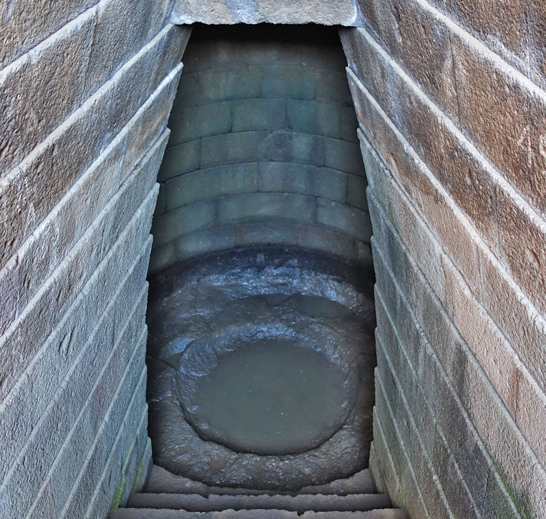 The tholos water is the visible surface of the local water table, hydraulically continuous with the groundwater permeating the Sardinian Craton. Infrasound propagating through the Craton enters the tholos water column through direct mechanical coupling at the rock-water interface — creating a second independent signal path driving the standing wave from the base upward simultaneously with the stairway path from above. Dual-terminus excitation builds coherent high-amplitude standing wave fields more efficiently than single-terminus excitation.