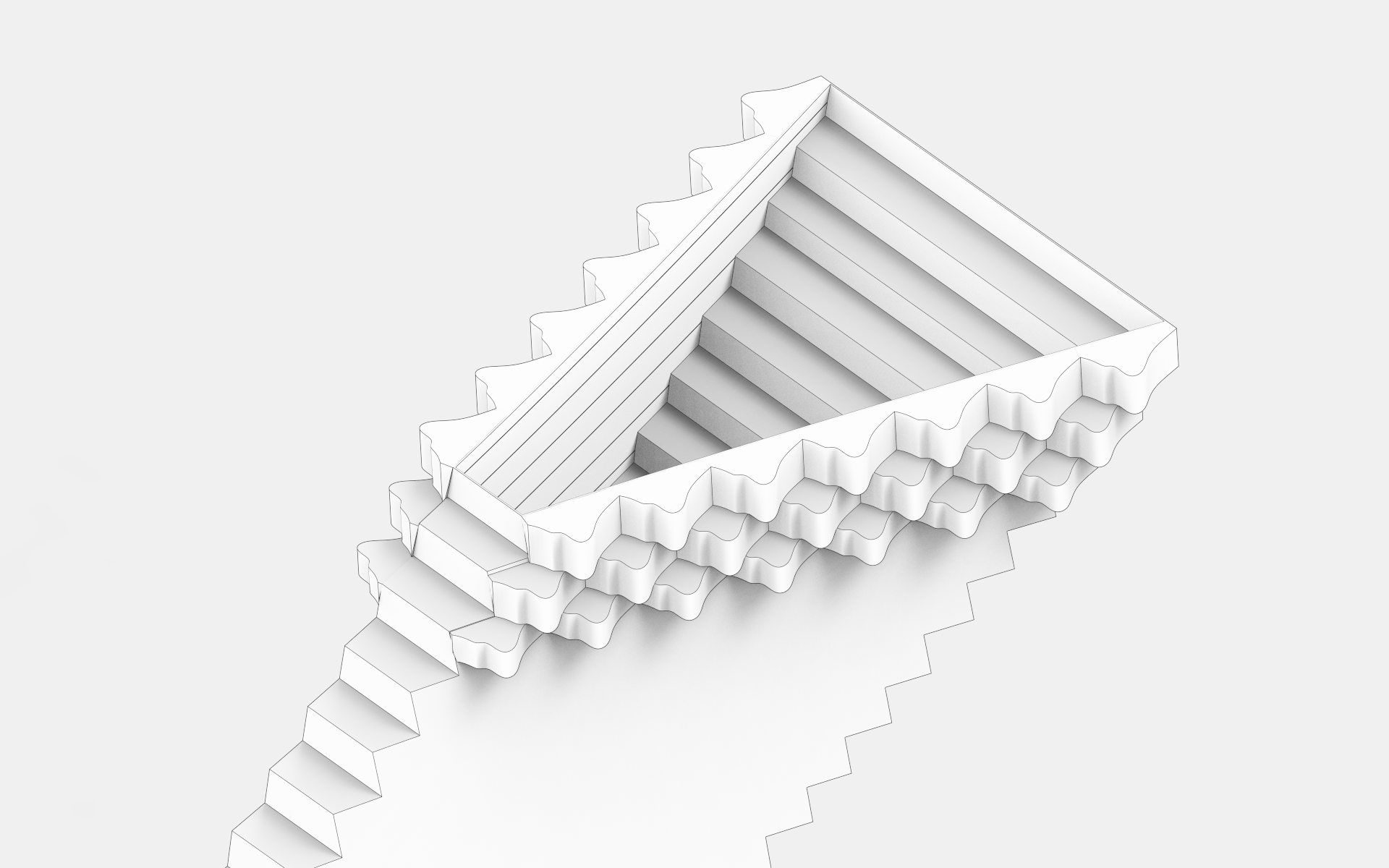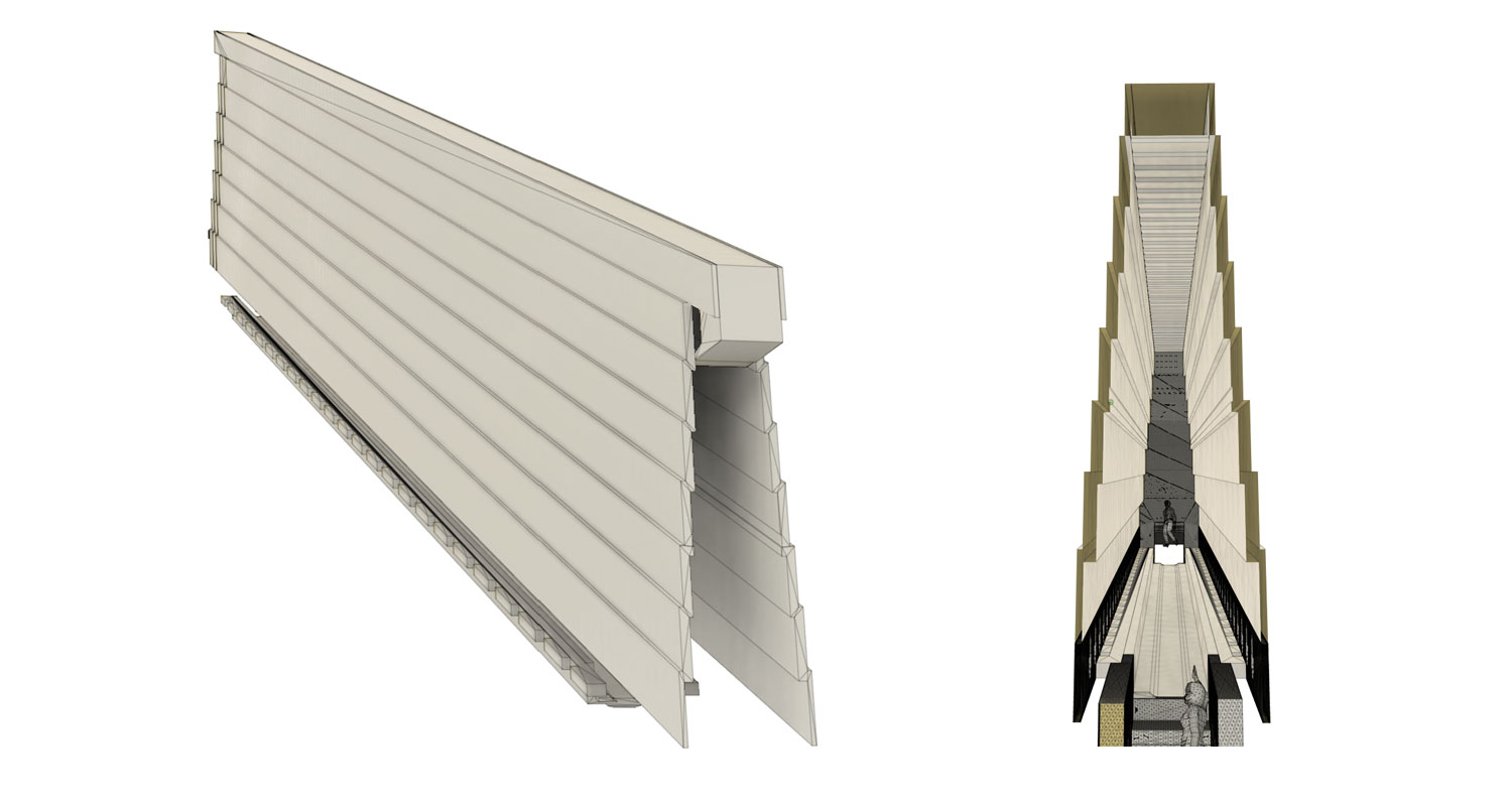 The stairway has 25 floor steps and 12 ceiling steps over an 11-meter slope length. These are not the same course spacing expressed on two surfaces — they are two distinct periodic geometries operating simultaneously in the same waveguide, producing two distinct constructive interference conditions.
