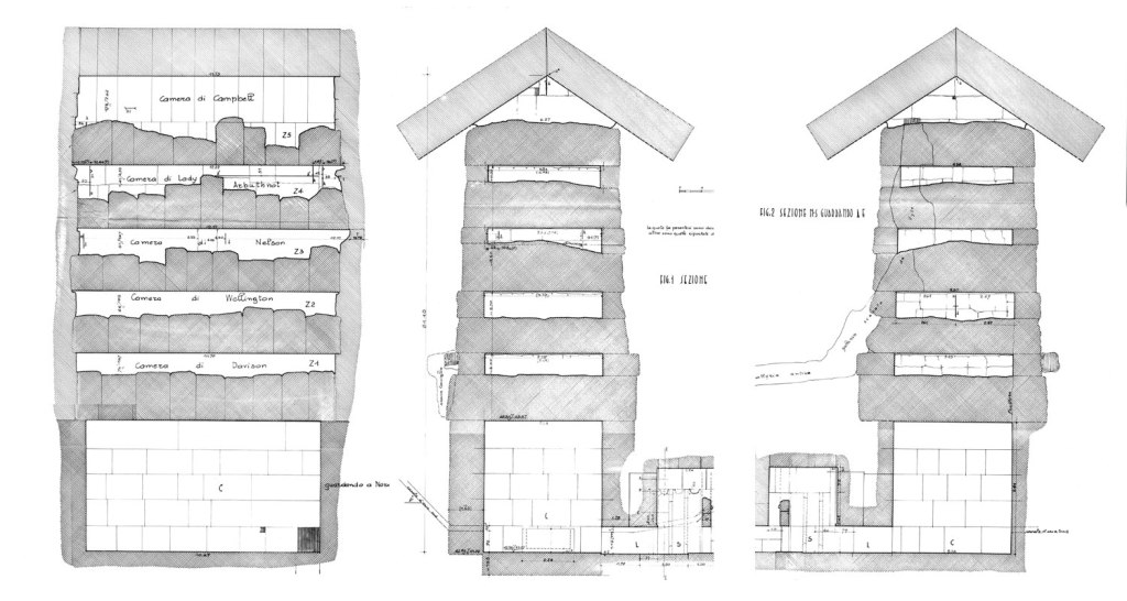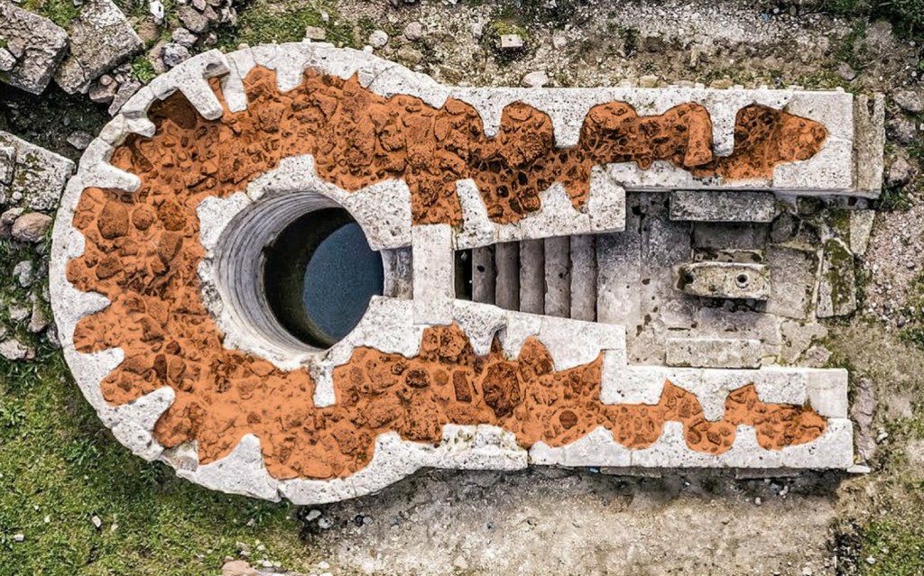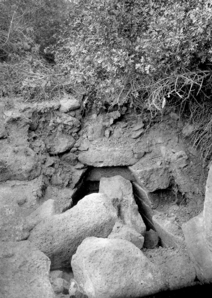 Buried by violence, preserved by burial The pre-restoration photograph shows chaotic overburden inconsistent with gradual silting. The subterranean wall courses — protected by the same fill that obscured the site — may preserve the original triangular profile geometry intact throughout their full depth. The destruction that buried Santa Cristina may be the reason the acoustic geometry survived.