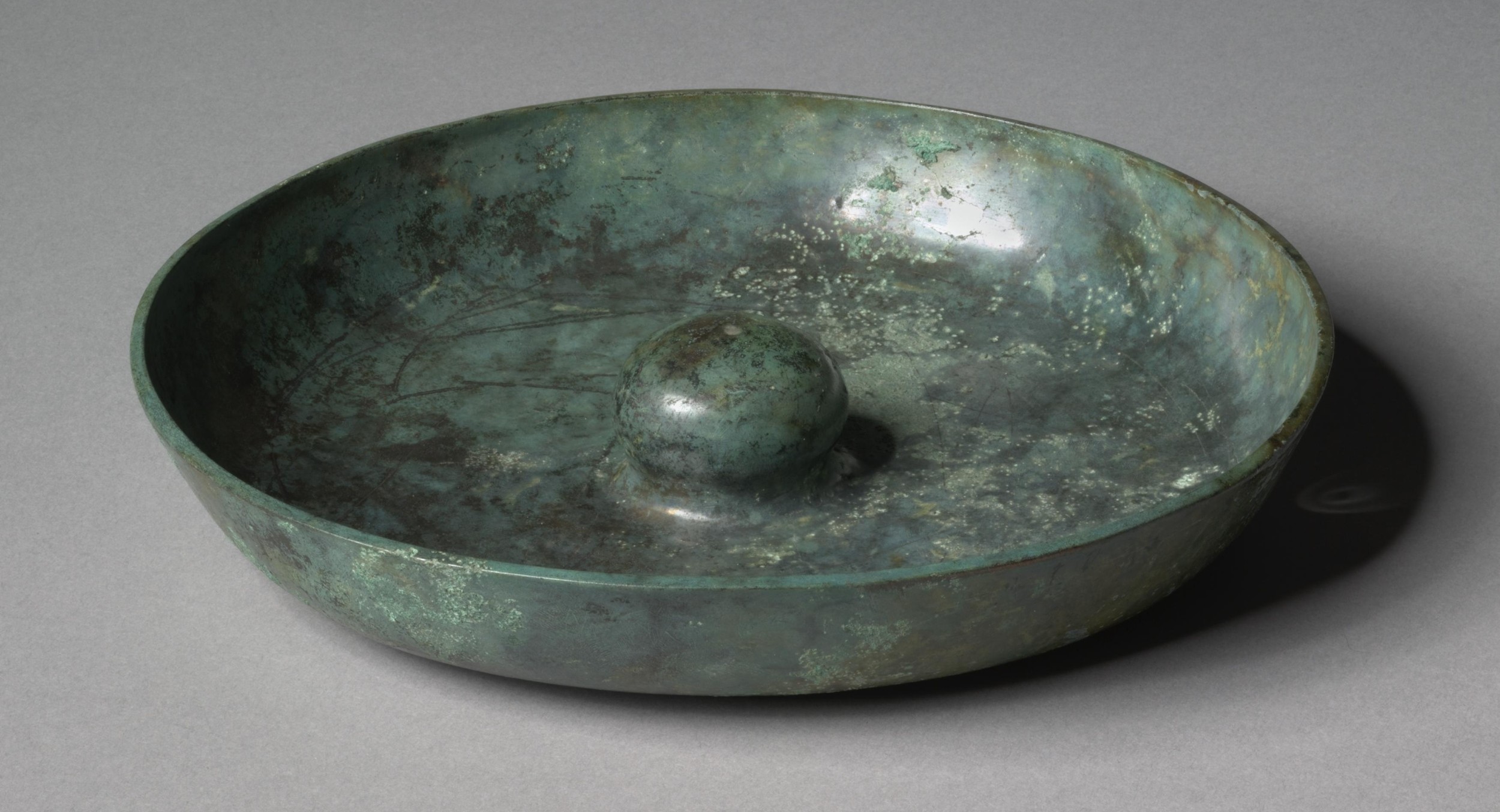 These objects are classified in archaeology as libation bowls — vessels used for ritual pouring of wine, oil, or water as offerings to gods. That classification is almost entirely inferential. It derives from depictions on Greek pottery showing figures holding phiales during ceremonies, a small number of dedicatory inscriptions, and the physical form itself — shallow and handleless. No consistent residue analysis confirms a specific poured liquid as primary use. The Met’s own catalogue entry on a large Etruscan phiale describes it as something that ‘may have been used for washing hands and feet before a banquet’ — a museum admitting it does not actually know. The libation designation tells us how these objects appeared in ceremonial contexts during the period from which we have iconographic evidence. It does not tell us what they were originally designed to do, or whether the pouring practice was a cultural inheritance of an earlier technical function that later users no longer fully understood. The geometry argues for the latter. The central omphalos protrudes upward from the interior floor of the bowl — it displaces volume, interrupts any liquid surface, and serves zero pouring function. A pouring vessel does not require a precision-formed interior protrusion, concentric zones of differentiated relief, or symmetric distributed mass elements. The form over-engineers the pouring function by an order of magnitude — which is exactly what you would expect from an object whose primary function was something else entirely.
