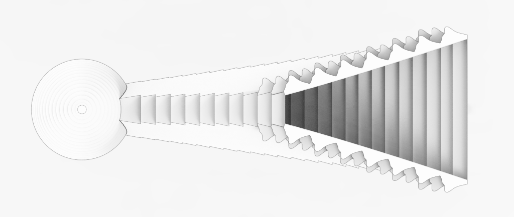 - Dual cascade frequencies — 25 floor steps and 12 ceiling steps over 11m producing 390 Hz and 187 Hz respectively; approximately one octave apart; two-channel harmonic amplification from one waveguide